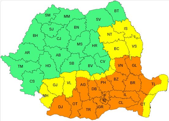 Codul galben vizează Capitala şi judeţele Teleorman, Argeş, Dâmboviţa, Giurgiu, Ilfov, Prahova, Ialomiţa, Călăraşi, Buzău, Brăila, Vrancea, Galaţi, Tulcea şi Constanţa.