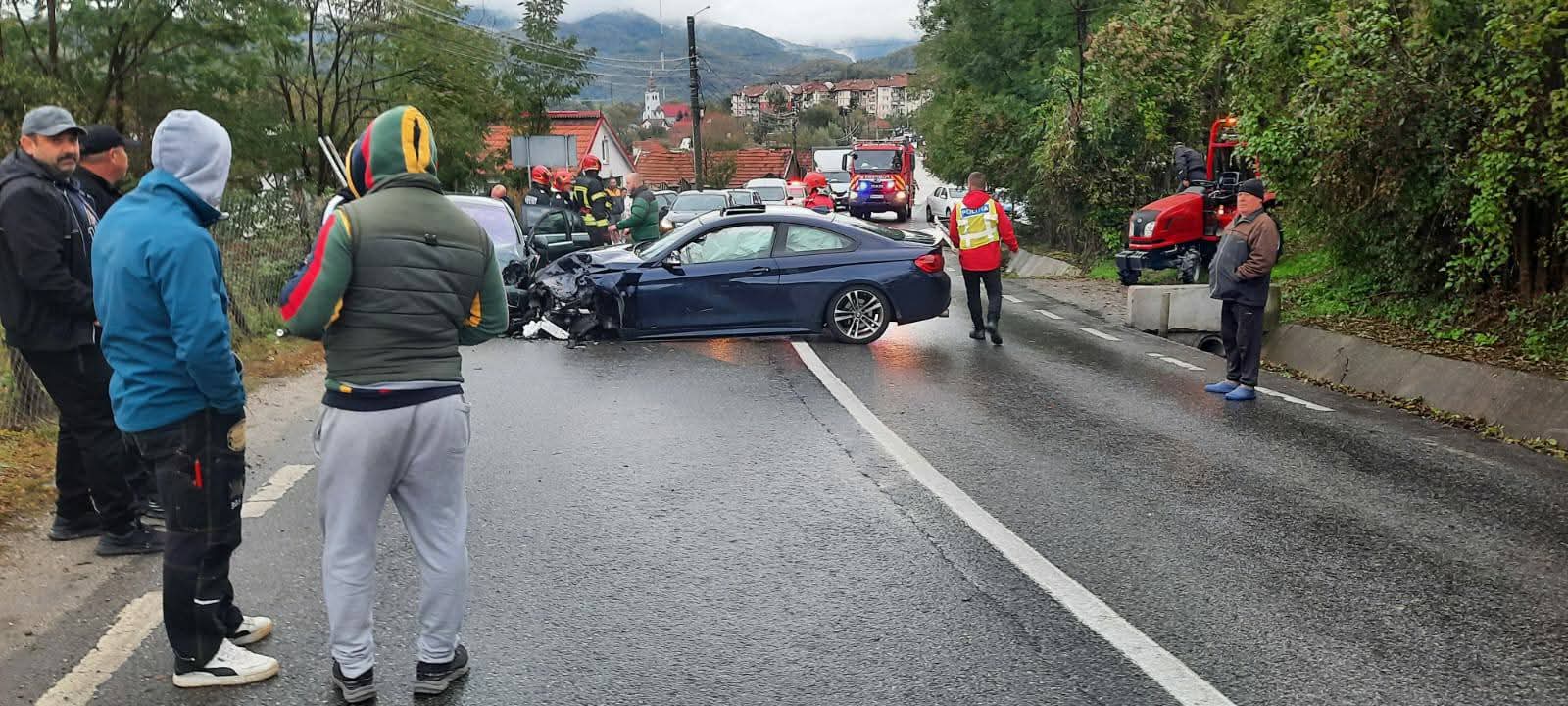6 oameni prinși în 3 mașini lovite de un șofer băut, pe DN66. FOTO