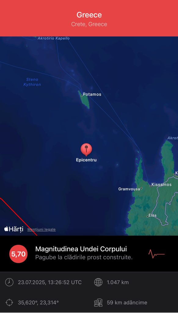 Un cutremur cu magnitudinea de 5,7 grade pe scara Richter s-a produs în această după-amiază în largul insulei Creta din Grecia, la o adâncime de aproximativ 59 de kilometri, potrivit unor aplicații seismice internaționale.
