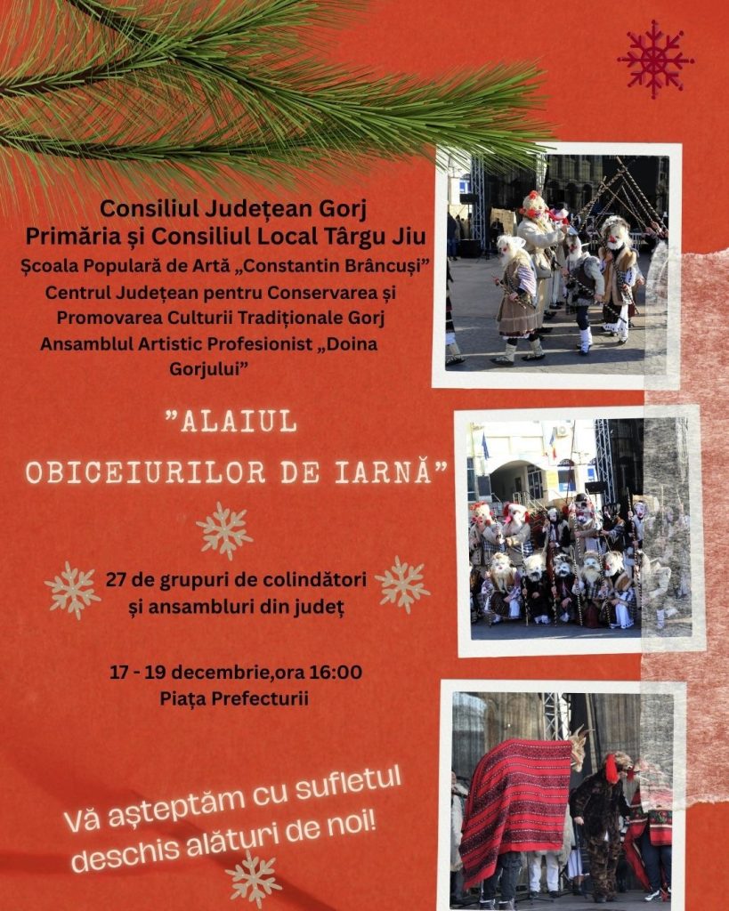 ”Alaiul obiceiurilor de iarnă” se va alătura Târgului de Crăciundin centrul municipiului Târgu Jiu, astfel, propunându-și săreaducă în actualitate spectaculoasele tradiții gorjenești.