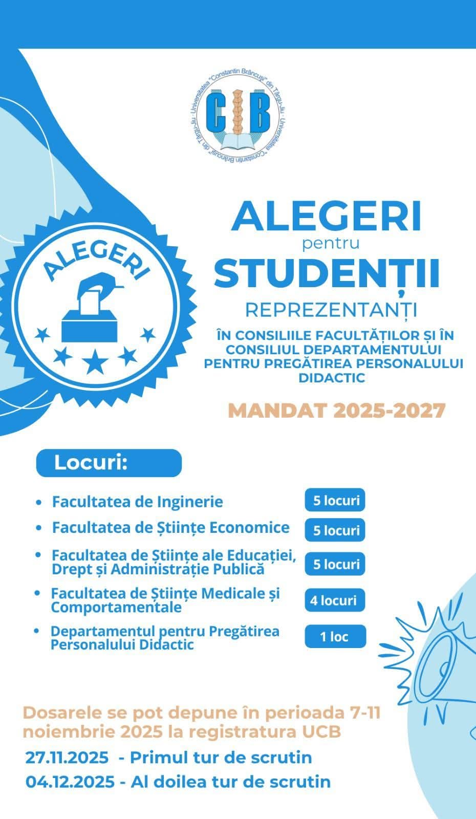 Studenții Universității „Constantin Brâncuși” (UCB) din Târgu Jiu sunt invitați să se implice activ în viața academică prin participarea la alegerile pentru reprezentanții studenților în consiliile facultăților și în Consiliul Departamentului pentru Pregătirea Personalului Didactic (DPPD), pentru mandatul 2025–2027.