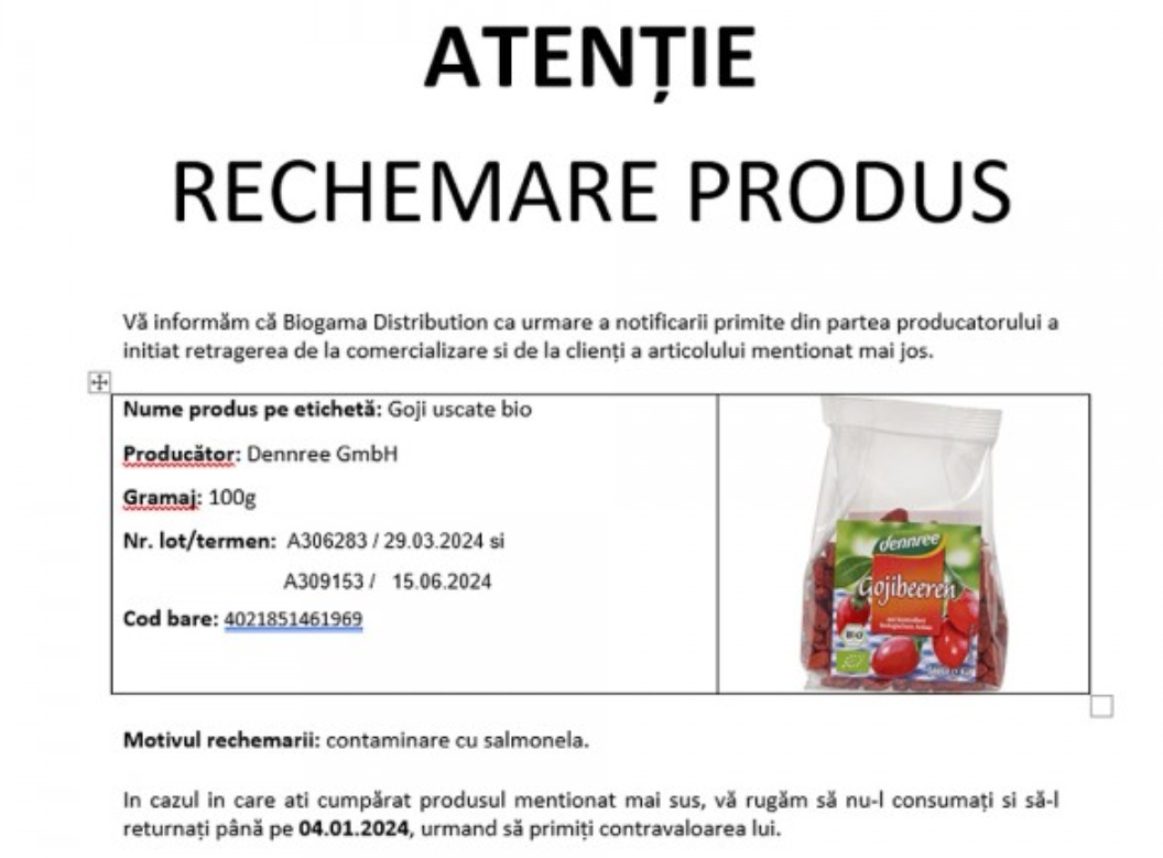 Potrivit unui comunicat afișat de Autoritatea Națională Sanitară Veterinară și pentru Siguranța Alimentelor (ANSVSA), Biogama Distribution recheamă un produs al cărui producător este Dennree GmbH. Este vorba despre produsul Goji uscate bio, 100 de grame, cu numărul de lot A306283, termen 29.03.2024, și cu numărul de lot A309153, termen 15.06.2024.