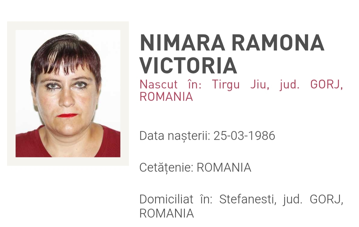 O femeie de 39 de ani, Ramona Victoria Nimară, din satul Ștefănești, orașul Târgu Cărbunești, este dată dispărută de mai bine de o săptămână, informează Poliția Română pe site-ul oficial, la rubrica „Persoane Dispărute”.