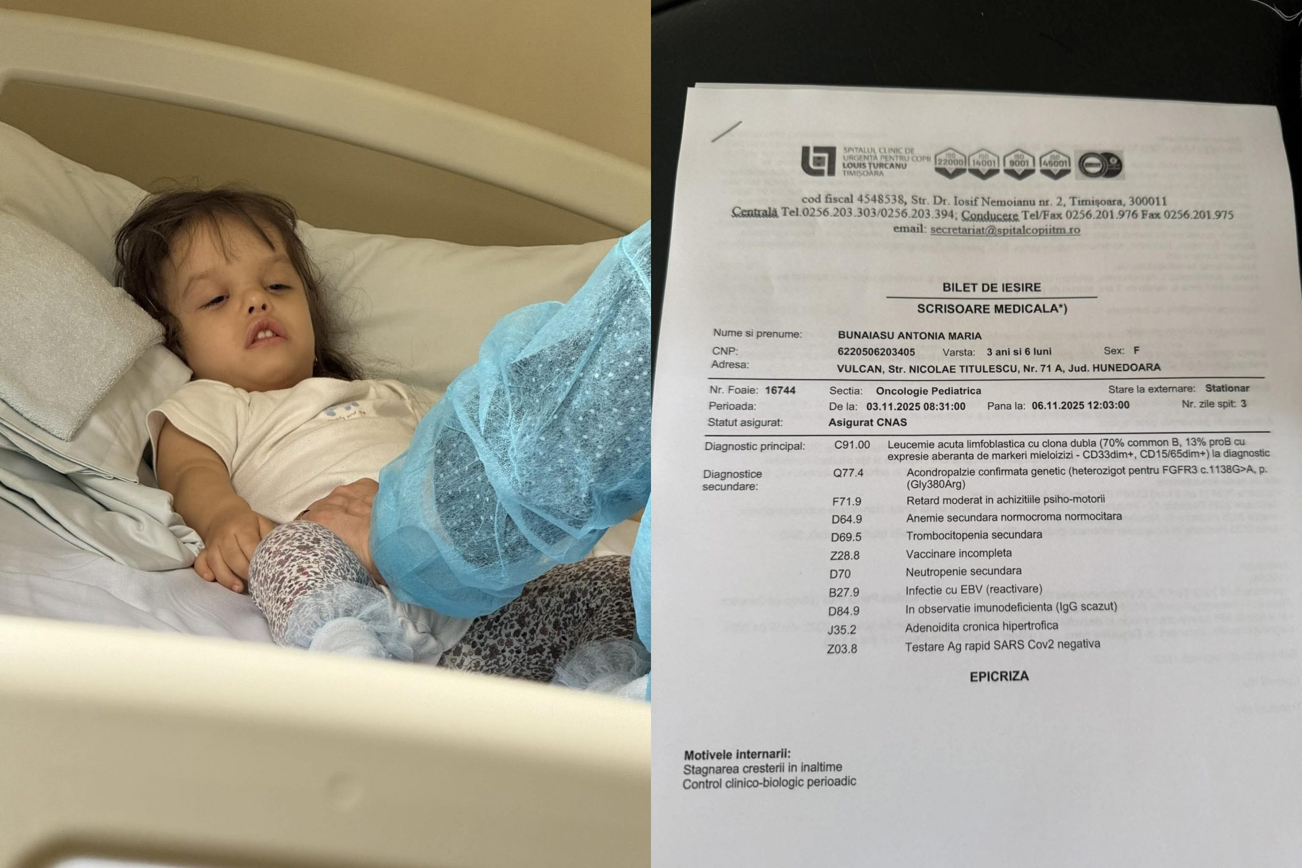 Antonia, o fetiță de 3 ani din Vulcan, a fost diagnosticată cu leucemie, un diagnostic grav care necesită intervenție rapidă și tratament specializat. Documentația medicală confirmă gravitatea situației și nevoia urgentă de tratament.