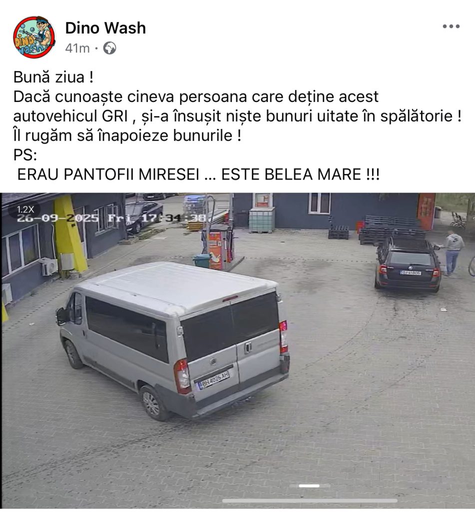 „Dacă cunoaște cineva persoana care deține acest autovehicul gri, și-a însușit niște bunuri uitate în spălătorie! Îl rugăm să înapoieze bunurile! PS: erau pantofii miresei… ESTE BELEA MARE!!!”
