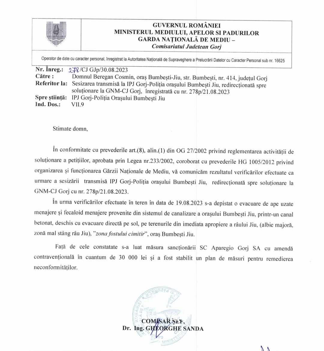 Incidentul a fost sesizat în urmă cu o săptămână, când la mică distanță de spitalul orășenesc, pe când, s-au sesizat deversări din conducta de canalizare. Atunci s-a sesizat că o parte din blocurile din oraș nu sunt legate la sistemul de canalizare, iar toate reziduurile ajungeau la subsolul acestor imobile. Pe 19 august Garda de Mediu a venit în control, împreună cu SGA Gorj și ISU pentru a verifica deversarea ilegală. Lucrurile s-au confirmat la fața locului.
