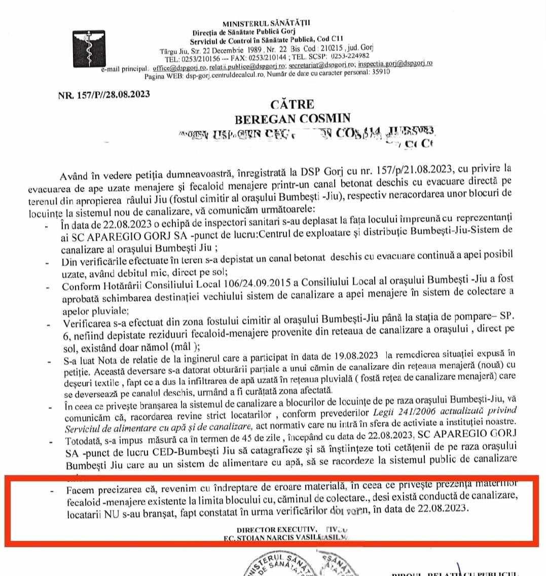 Garda de Mediu Gorj a amendat Aparegio, punctul de lucru CED Bumbești Jiu, cu 30.000 de lei, pentru deversarea, recentă din sistemul de canalizare, lângă spitalul din oraș. Nu este singura sancțiune primită de Aparegio. Asta deoarece DSP Gorj confirmă că o parte din blocurile din oraș nu sunt legate la sistemul de canalizare aflat în funcțiune. Direcția a impus Aparegio să înștiințeze, în 45 de zile, cetățenii de la blocurile în cauză să se racordeze la sistemul de canalizare, pentru care oricum plăteau lunar o taxă, în timp ce reziduurile lor menajere și fecaloide, ajungeau la limita imobilelor, adică la subsol. Asta deși există conductă de canalizare pe care în ultimele decenii acești locatari nu au folosit-o. Se confirmă astfel focarul de infecție existent, atât în oraș, cât și pe terenul unde se deversau acest surplus.