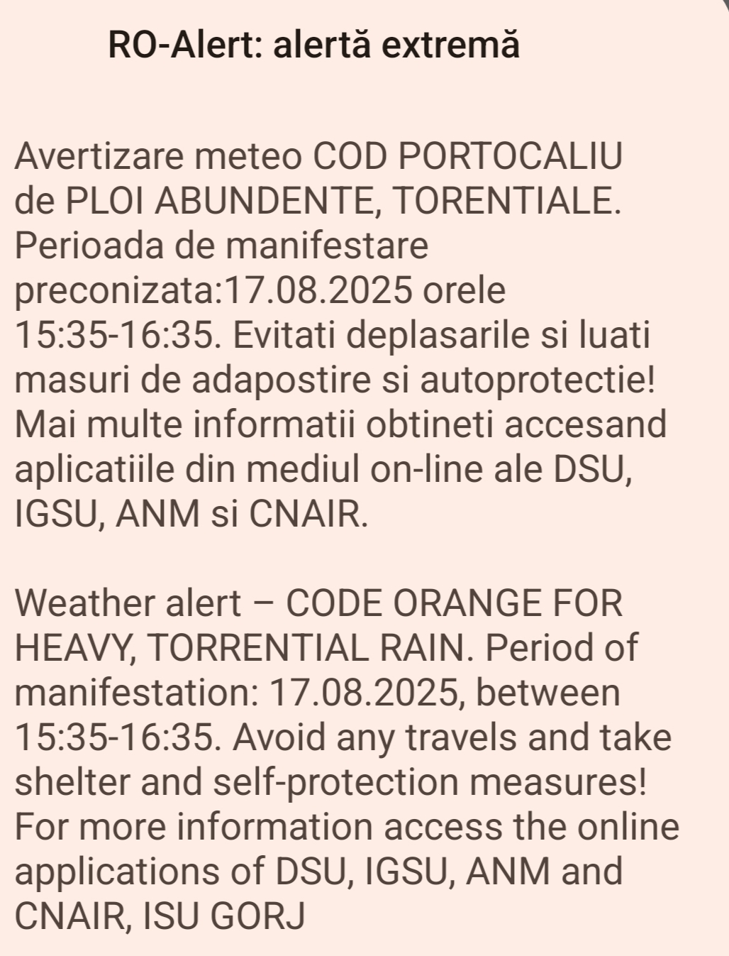Perioada de manifestare preconizata:17.08.2025 orele 15:35-16:35. Evitati deplasarile si luati masuri de adapostire si autoprotectie!