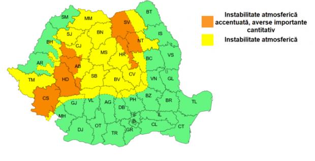 România este împărțită duminică, între caniculă și ploi și vijelii, iar meteorologii au emis mai multe avertizări cod galben și portocaliu. De altfel, aversele, vijeliile și grindina vor afecta mare parte din țară, până luni la ora 23.00.