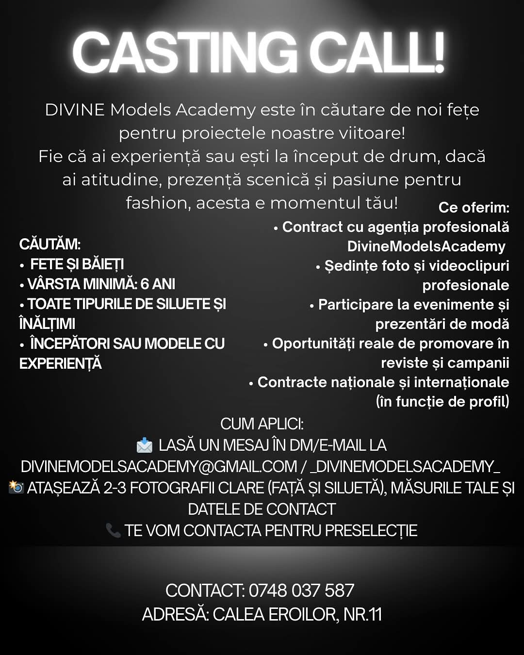 „Căutăm atitudine, pasiune și prezență scenică. Restul se învață!”, transmit reprezentanții DIVINE Models Academy.