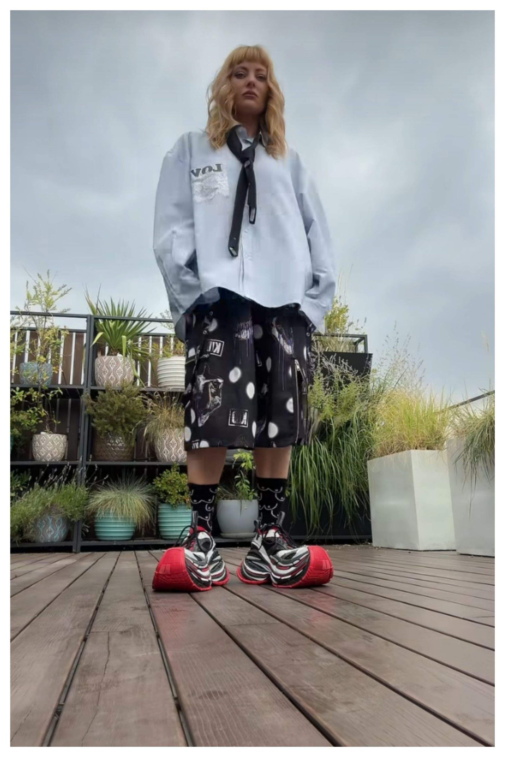 Delia face din nou senzație! Soția afaceristului Răzvan Munteanu din Târgu Jiu, mereu în pas cu cele mai îndrăznețe trenduri, a atras toate privirile cu o pereche de sneakersi de lux, cu platformă de 16 centimetri, în nuanțe îndrăznețe de roșu, alb și negru.