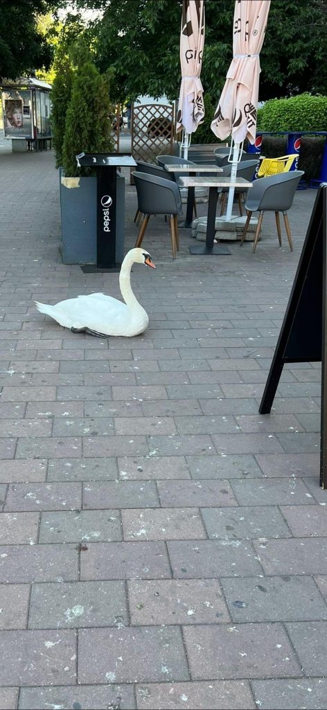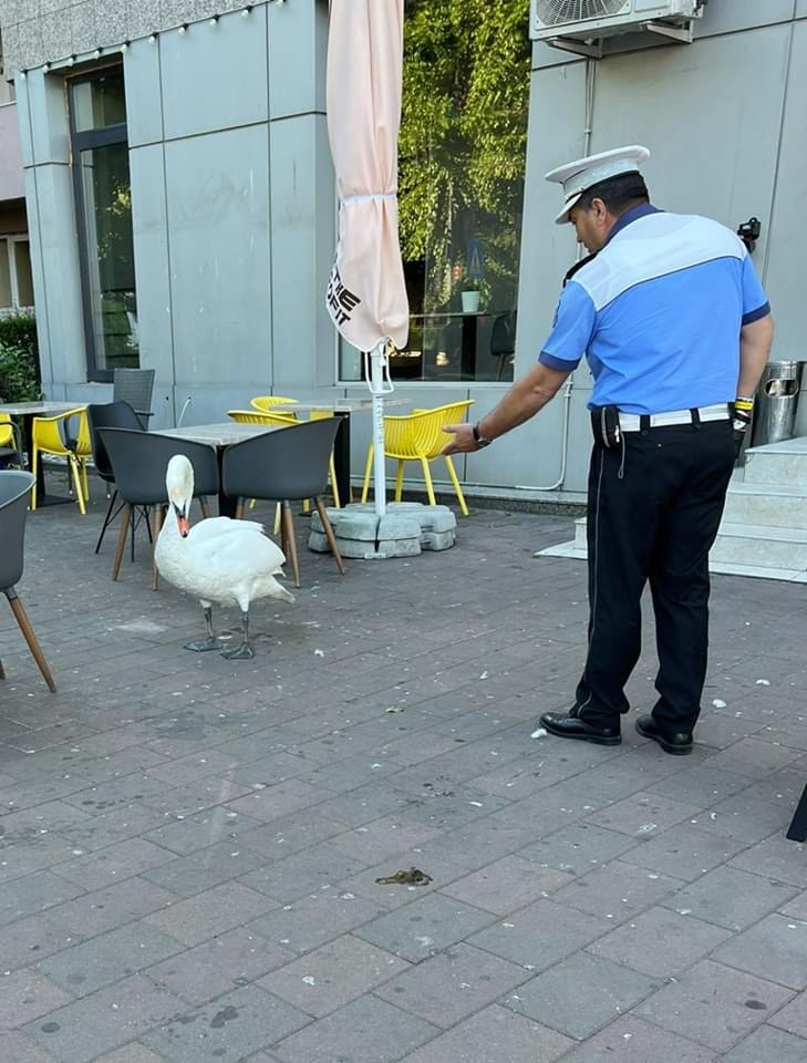Astăzi polițiștii locali ai fost solicitați pentru a îndepărta o lebădă care se afla într/o zona a unei terase de pe Bulevardul Constantin Brâncuși din Târgu Jiu.