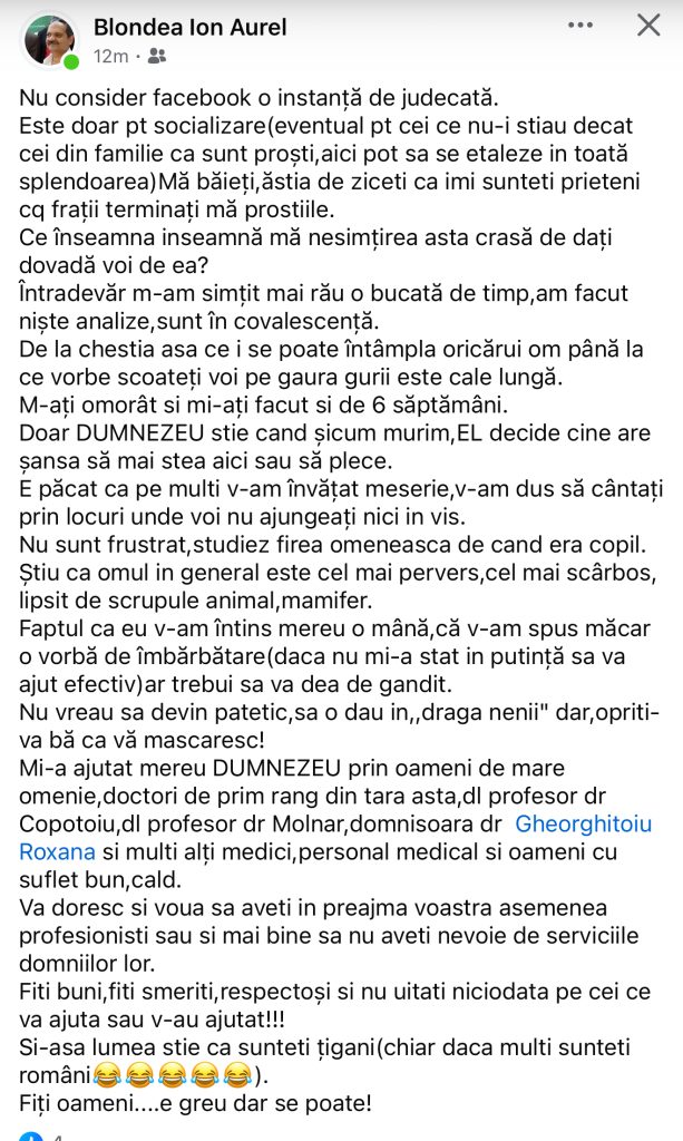 Blondea a menționat că, deși a avut probleme de sănătate și a efectuat analize medicale, este în convalescență și nu există motive de îngrijorare excesivă. El a criticat dur pe cei care au răspândit zvonuri despre decesul său, considerând acest comportament drept o lipsă crasă de respect și bun-simț.