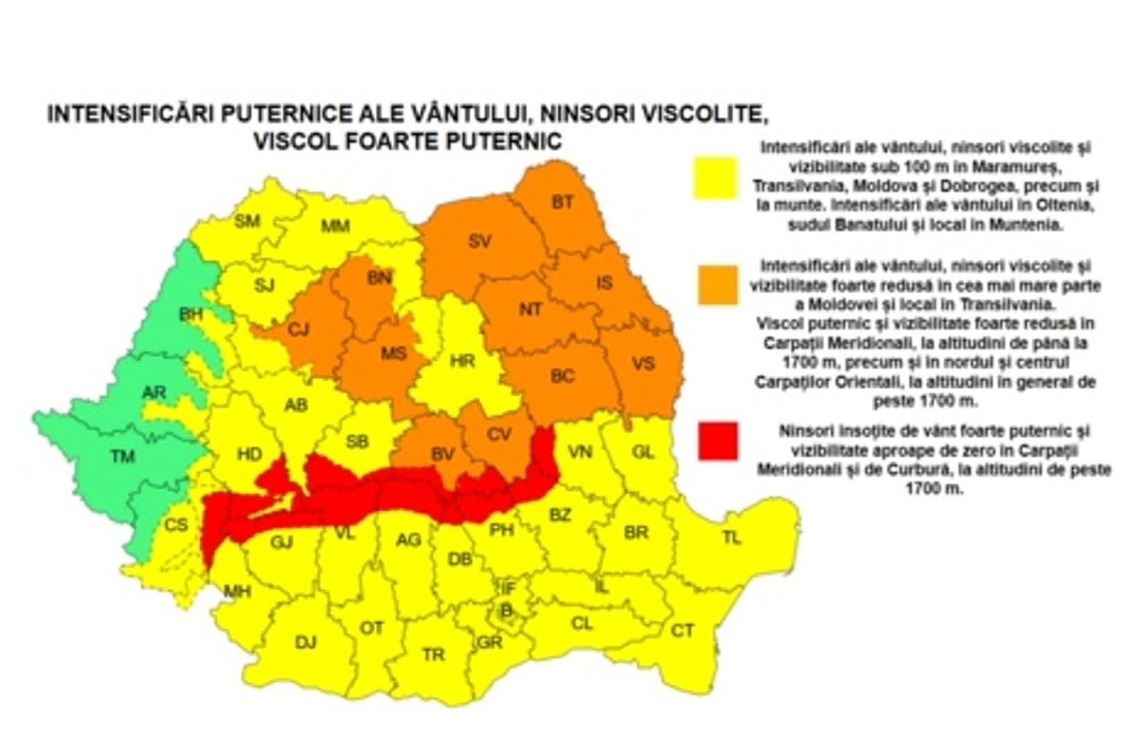 👉 În Carpații Meridionali, la altitudini de peste 1700 m, sunt așteptate rafale de vânt de peste 120 km/h, viscol puternic și vizibilitate aproape zero.