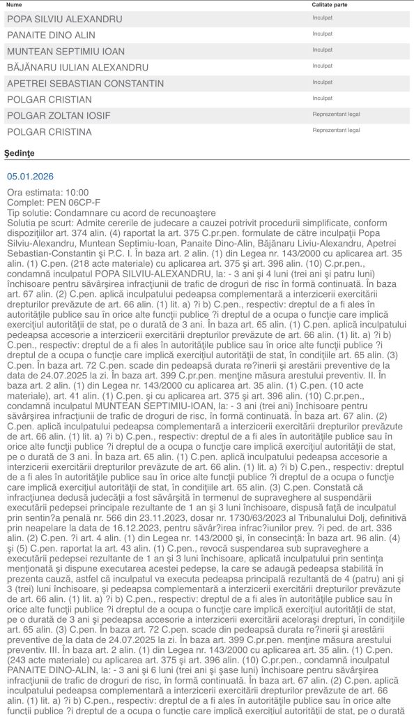 - Popa Silviu-Alexandru a fost condamnat la 3 ani și 4 luni de închisoare, pentru trafic de droguri de risc în formă continuată (218 acte materiale). Instanța a menținut arestul preventiv și a dispus interzicerea unor drepturi civile.