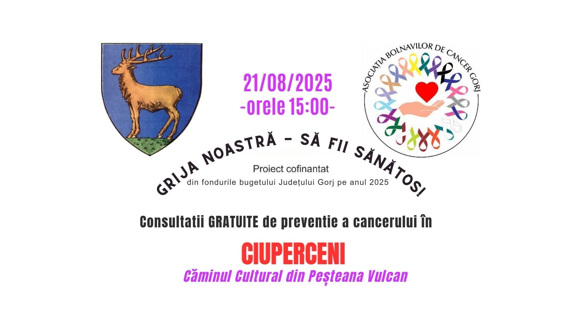 Asociația Bolnavilor de Cancer Gorj dă startul unei noi ediții a proiectului „Grija noastră – Să fii sănătos!”, cofinanțat din bugetul județului Gorj pe anul 2025, printr-un eveniment medical dedicat comunității din Ciuperceni.