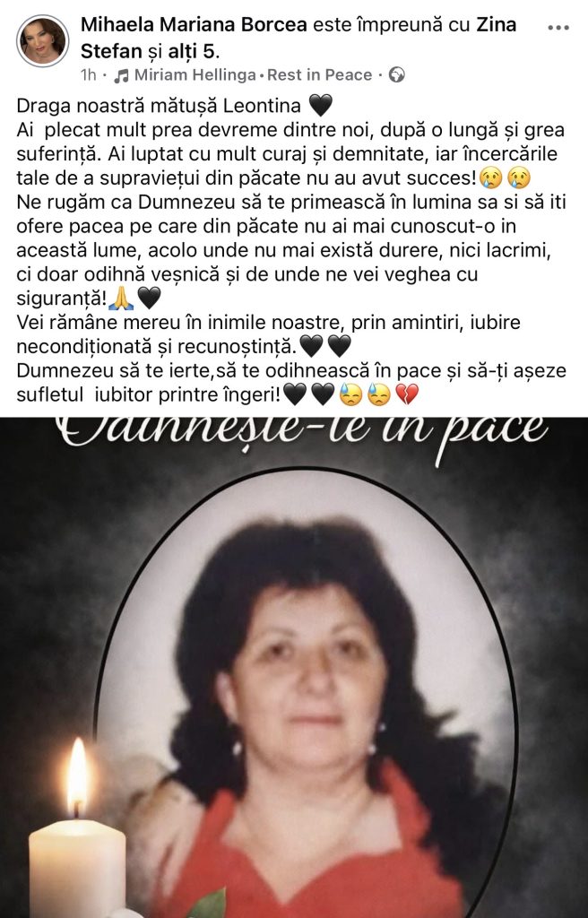 Dumnezeu să te ierte,să te odihnească în pace și să-ți așeze sufletul iubitor printre îngeri”, a scris Mihaela Borcea pe Facebook.