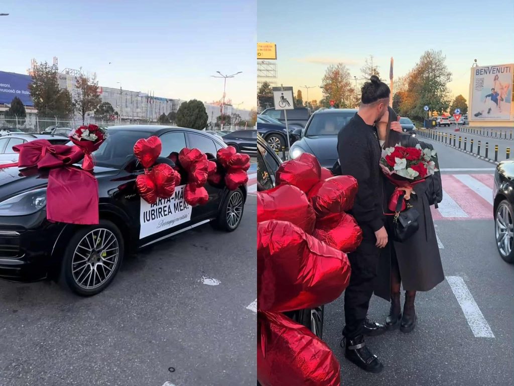 Iubita bărbatului din Cluj-Napoca a primit mașina într-o parcare, în timp ce era urcată pe platformă. Dincolo de mesajul care le-a cucerit pe domnișoarele din România, aceasta a mai primit baloane în formă de inimă.