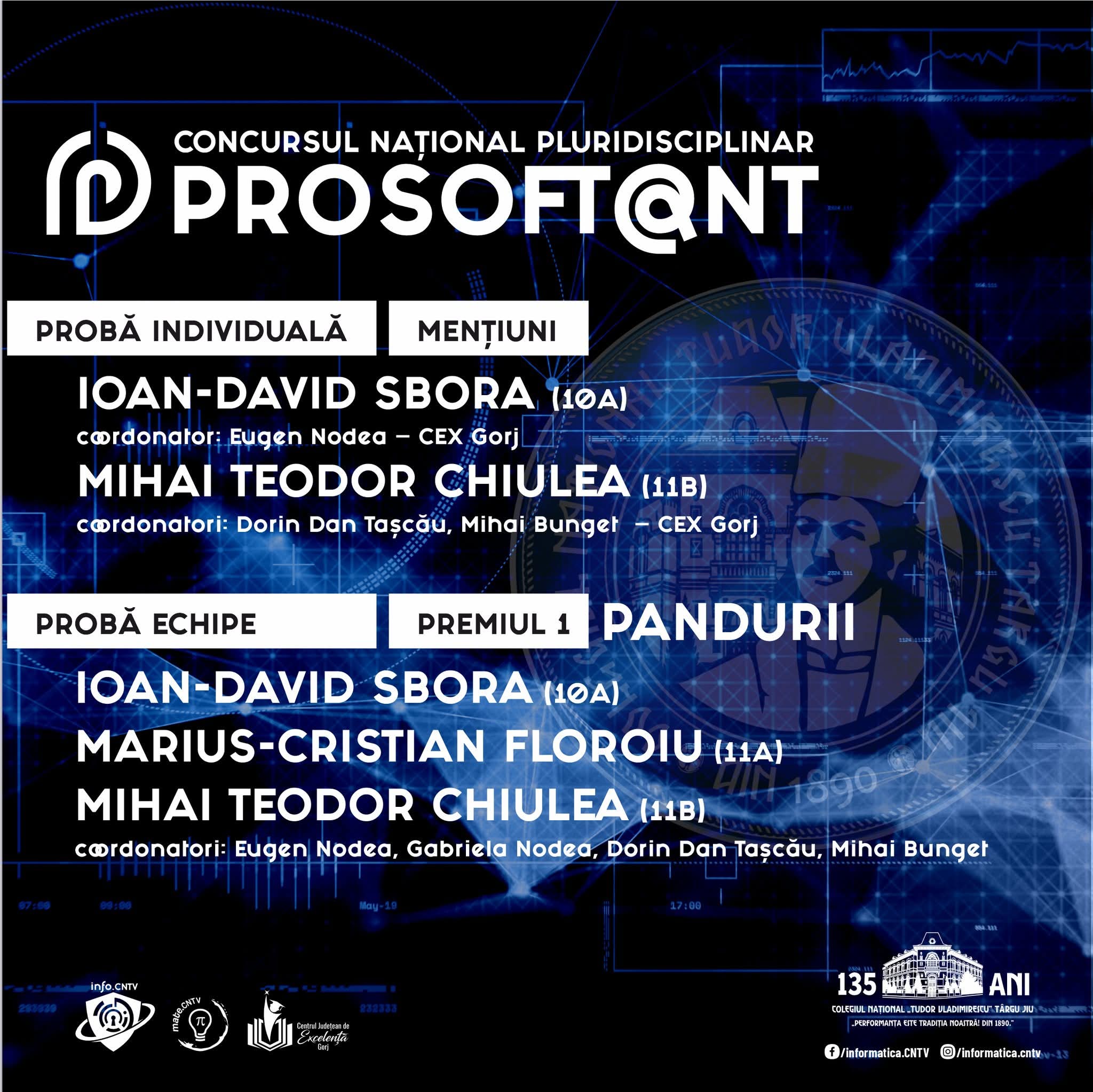 Elevii Colegiului Național „Tudor Vladimirescu” din Târgu Jiu au obținut rezultate remarcabile la Concursul Național Pluridisciplinar PROSOFT@NT, desfășurat în perioada 3–5 martie 2026, la Piatra-Neamț, competiție care a reunit participanți din 30 de județe ale României.
