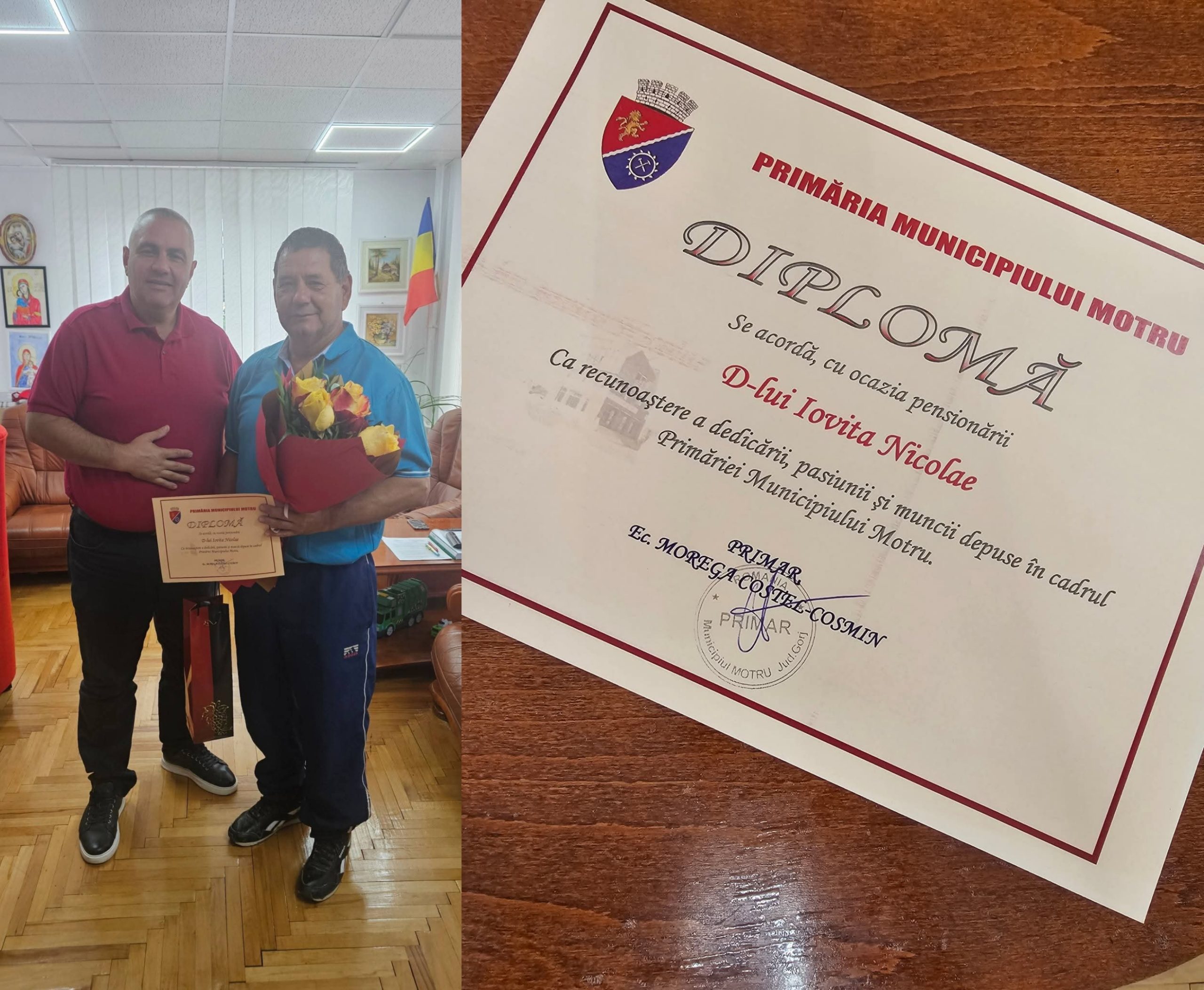 Un moment emoționant a avut loc la Primăria Municipiului Motru, unde Nicolae Iovița, angajat al Poliției Locale, și-a încheiat activitatea odată cu ieșirea la pensie.