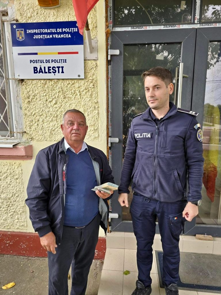 Un gest remarcabil de corectitudine a fost semnalat recent în județul Vrancea. Un bărbat care a găsit 24.100 de lei în zona târgului din Dumbrăveni nu a ezitat să predea imediat suma polițiștilor Postului de Poliție Bălești.