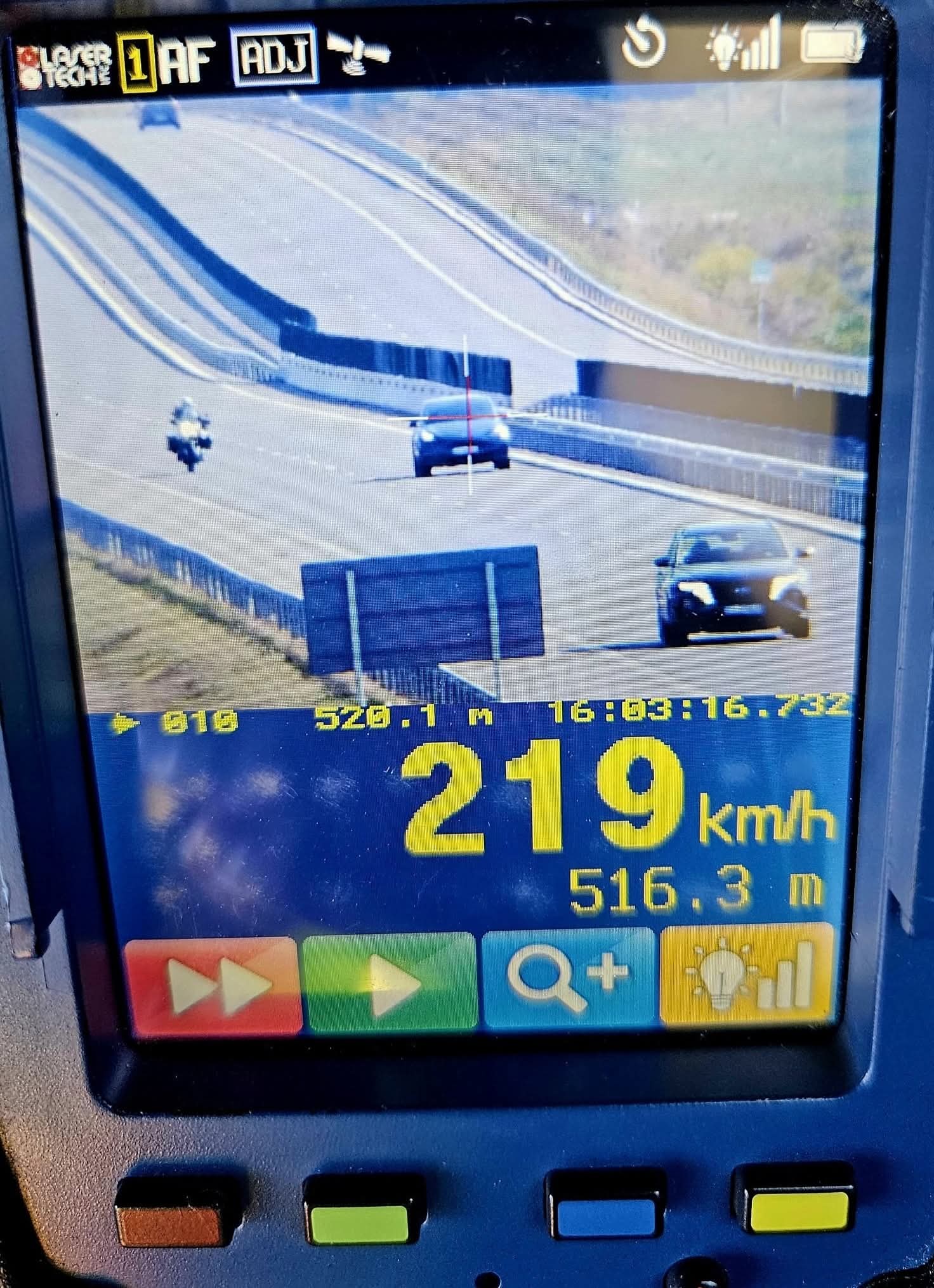 „Colegii noștri au surprins cu puțin timp în urmă pe utostradă un conducător auto grăbit… foarte grăbit. Aparatul radar a arătat viteza de 219 km/h și, pentru cârcotași, o spunem din start că are toate verificările și omologările valabile.