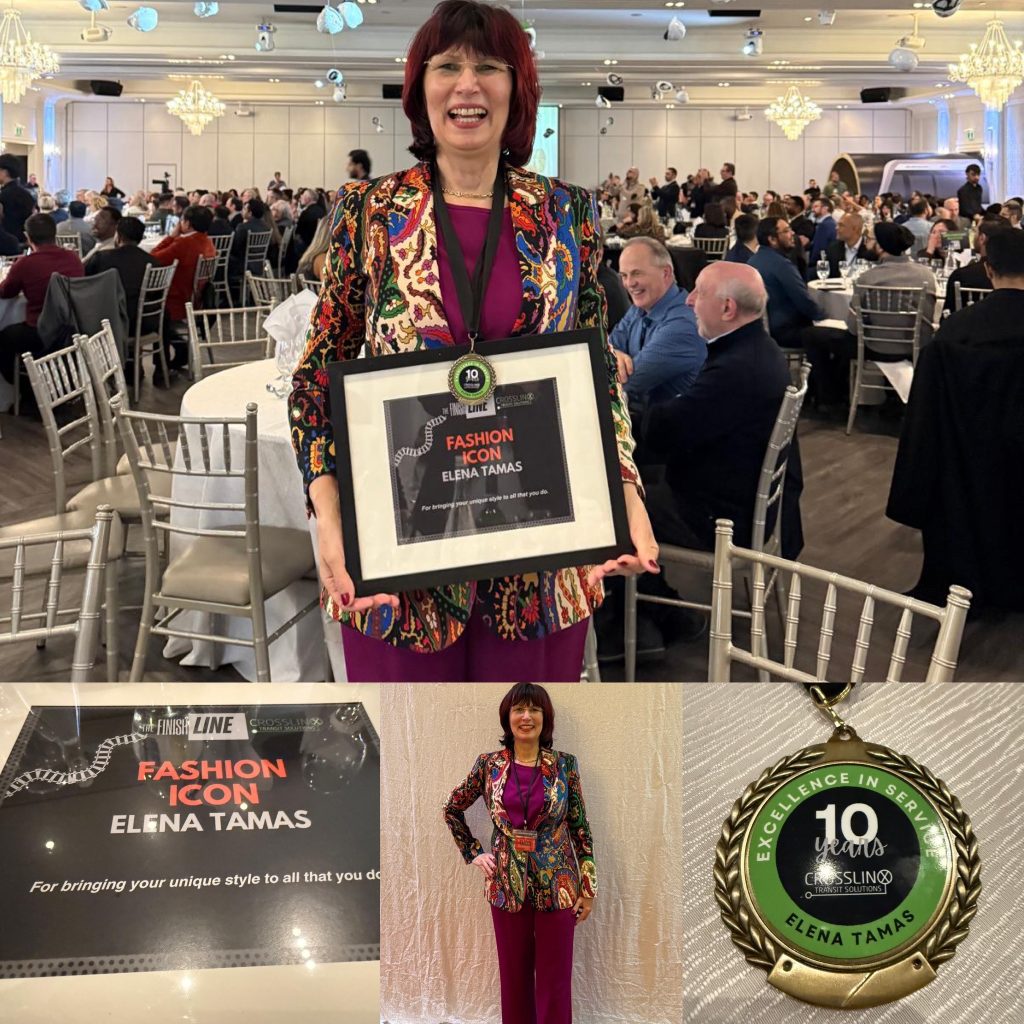 La eveniment au participat numeroși colegi și lideri de proiect, iar Elena Tamaș a fost unul dintre cei premiați. Cu o carieră de 43 de ani în finanțe desfășurată atât în România, cât și în Canada, Elena a primit cu mândrie două distincții speciale: medalia aniversară „Excellence in Service – 10 Years” pentru dedicarea și munca susținută în cadrul Crosslinx și o diplomă înrămată cu titlul „Fashion Icon”, oferită pentru modul în care aduce un stil unic în tot ceea ce face (exact așa cum scrie pe diploma înrămată din fotografie).