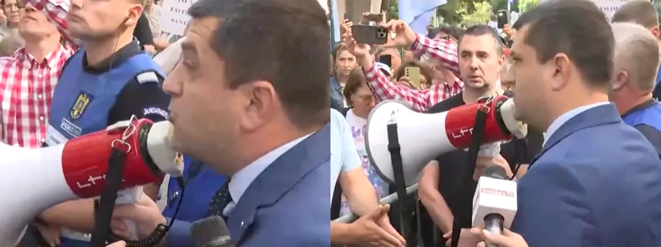 În fața nemulțumiților, ministrul Economiei, Radu Miruță, deputat USR de Gorj, a apărut purtând o portavoce, simbolul prezenței sale directe în dialogul cu protestatarii. Ministrul le-a transmis oamenilor: