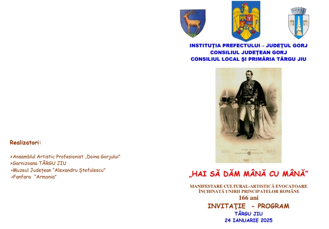 Consiliul Județean Gorj, alături de Prefectura Gorj și Primăria Târgu Jiu vor organiza vineri, 24 ianuarie 2025, o serie de manifestări cultural-artistice pentru a sărbători Ziua Unirii Principatelor Române.
