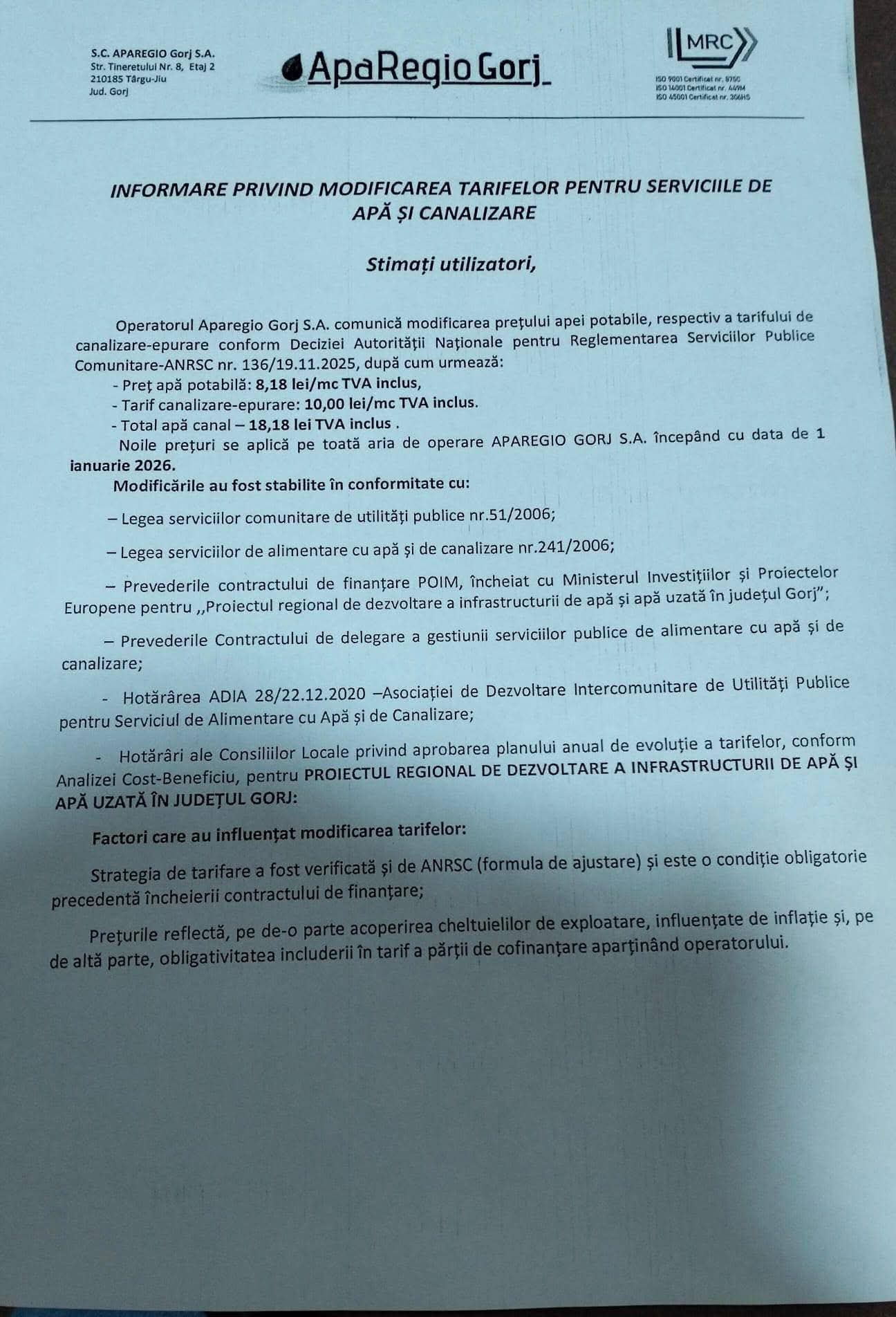 Potrivit informării publicate de operator (foto), prețurile aprobate în urma Deciziei ANRSC nr. 136/19.11.2025 sunt următoarele: