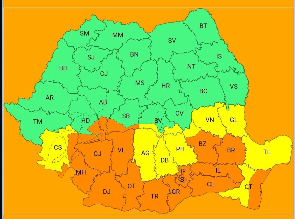 Administrația Națională de Meteorologie a emis mai multe alerte de cod portocaliu, care vizează ploi abundente, vânt puternic și ninsori consistente la altitudini mari.