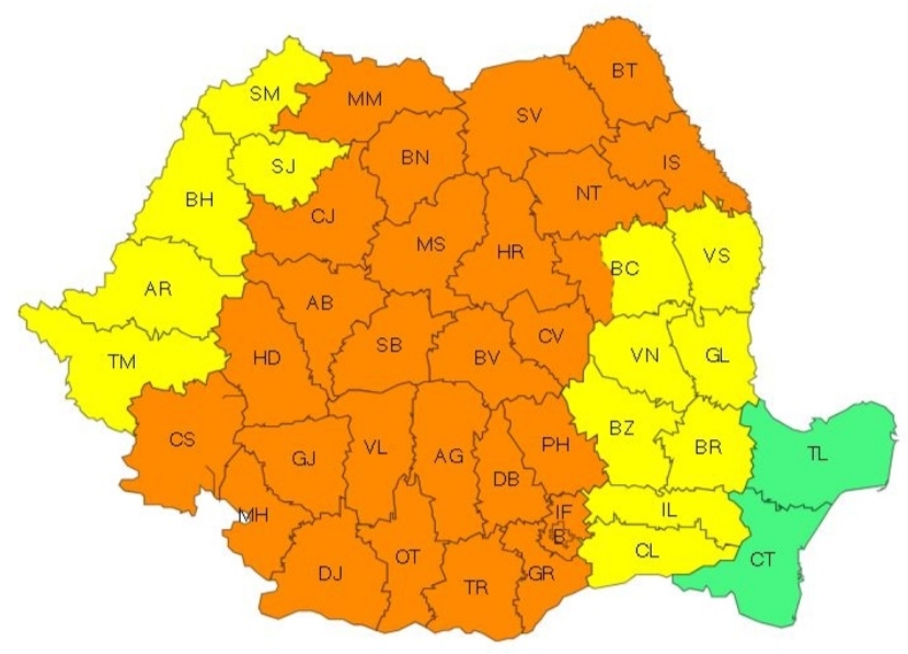 Judeţele din restul ţării (cu excepţia judeţelor Constanţa şi Tulcea) se vor afla sub avertizare Cod galben de instabilitate atmosferică în acelaşi interval de timp. În Crişana, nord-vestul Transilvaniei şi local în Banat, Maramureş, Muntenia şi Moldova, vor fi averse torenţiale, intensificări ale vântului (rafale în general de 50…70 km/h), vijelii, grindină şi descărcări electrice. În intervale scurte de timp sau prin acumulare cantităţile de apă vor fi de 20…30 l/mp şi izolat de peste 40 l/mp.