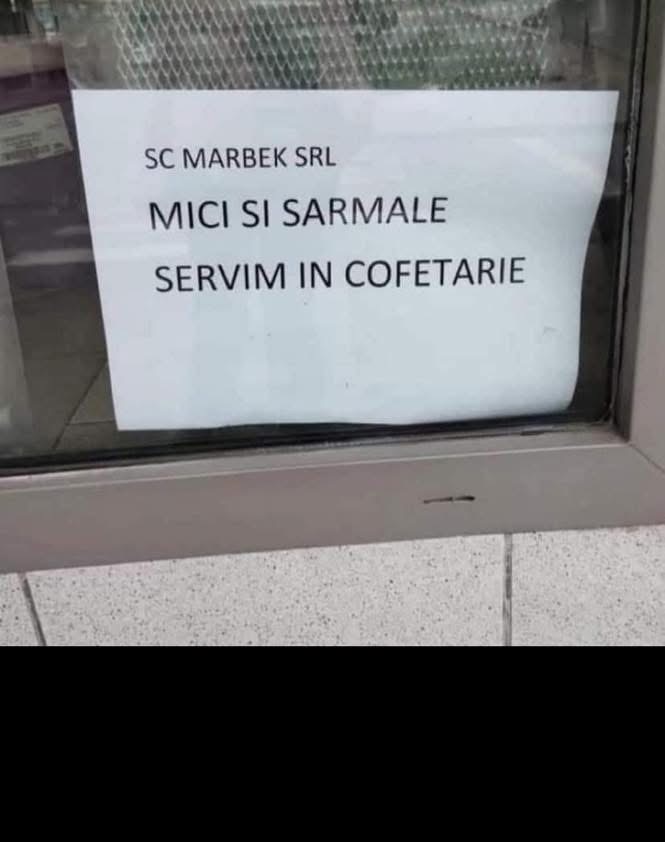 Un anunț lipit pe geam i-a făcut pe mulți să zâmbească: „MICI ȘI SARMALE – SERVIM ÎN COFETĂRIE”.