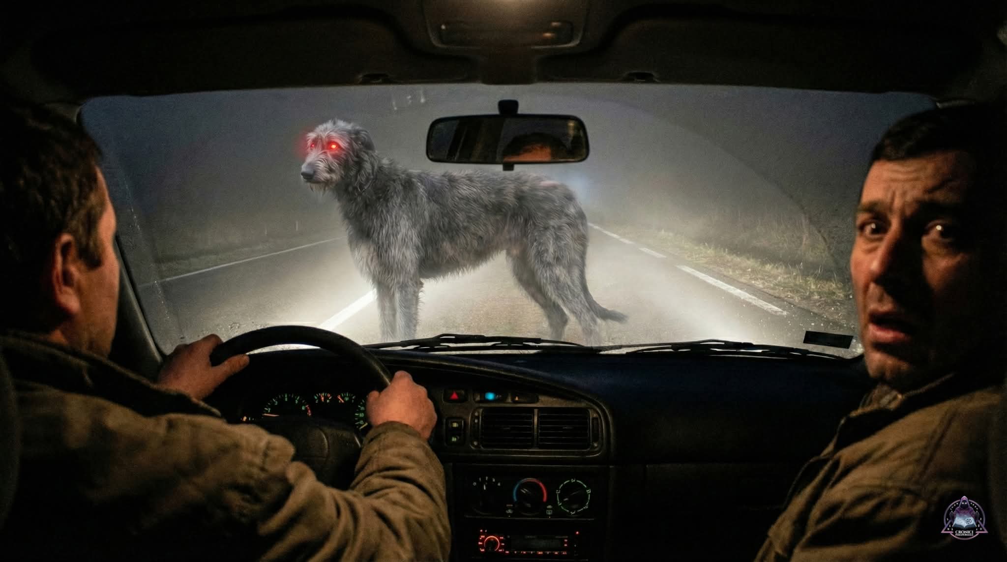 Dintr-odată, el n-a mai vorbit deloc. Se uita pe geamul lateral din dreapta, nemișcat. M-am uitat către el să văd unde privește și de ce stă așa, ca blocat. Uitându-mă atent pe geamul din dreapta, fix unde privea el, am văzut un câine foarte mare care mergea pe lângă mașină. Și nu era un câine obișnuit — era imens. Cumva, prin întuneric și ceață, se vedea destul de bine că alerga lângă noi, deși eu mergeam foarte încet.