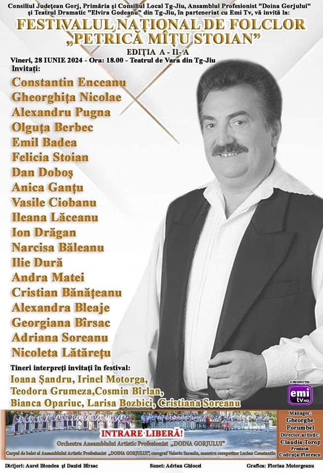 Festivalul Național de Folclor „Petrică Mîțu Stoian” ediția a II-a va avea loc în data de 28 iunie 2024, în Târgu Jiu!