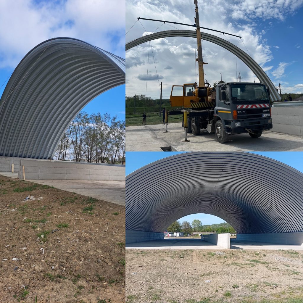Platforma contribuie la optimizarea procesului tehnologic și la protecția mediului, asigurând condiții eficiente pentru depozitarea nămolurilor deshidratate. Construcția este realizată cu o structură metalică autoportantă, cu formă arcuită, având dimensiunile de 25,75 x 48,00 m și o înălțime maximă de 10,40 m. Structura este susținută de pereți laterali din beton armat și include un perete de compartimentare, fiind proiectată pentru funcționare eficientă și durabilă.