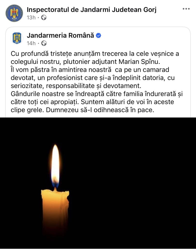 Jandarmeria Gorj mesaj după moartea colegului lor în vârstă de 40 de ani!