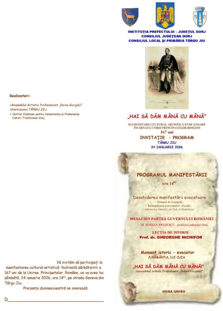 Cea de-a doua manifestare, „Hai să dăm mână cu mână”, va avea loc vineri, 24 ianuarie 2026, de la ora 14.00, în municipiul Târgu Jiuiu, pe strada Geneva, și este dedicată împlinirii a 167 de ani de la Unirea Principatelor Române.