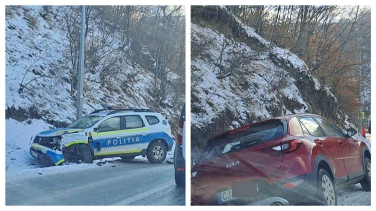 Un șofer a pierdut controlul mașinii, cel mai probabil din cauza poleiului de pe carosabil și a acroșat o mașină de Poliție. Ambele autoturisme au fost avariate în urma evenimentului rutier, care, din fericire, s-a soldat doar cu pagube materiale.