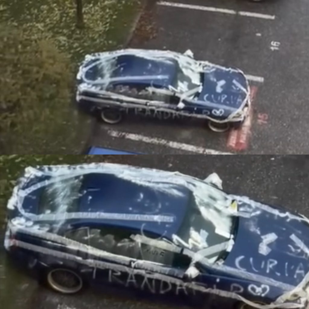 Pe caroserie au apărut mesaje și desene realizate cu o substanță de culoare deschisă, semn că autorul sau autorii au ținut să lase și o „semnătură”.
