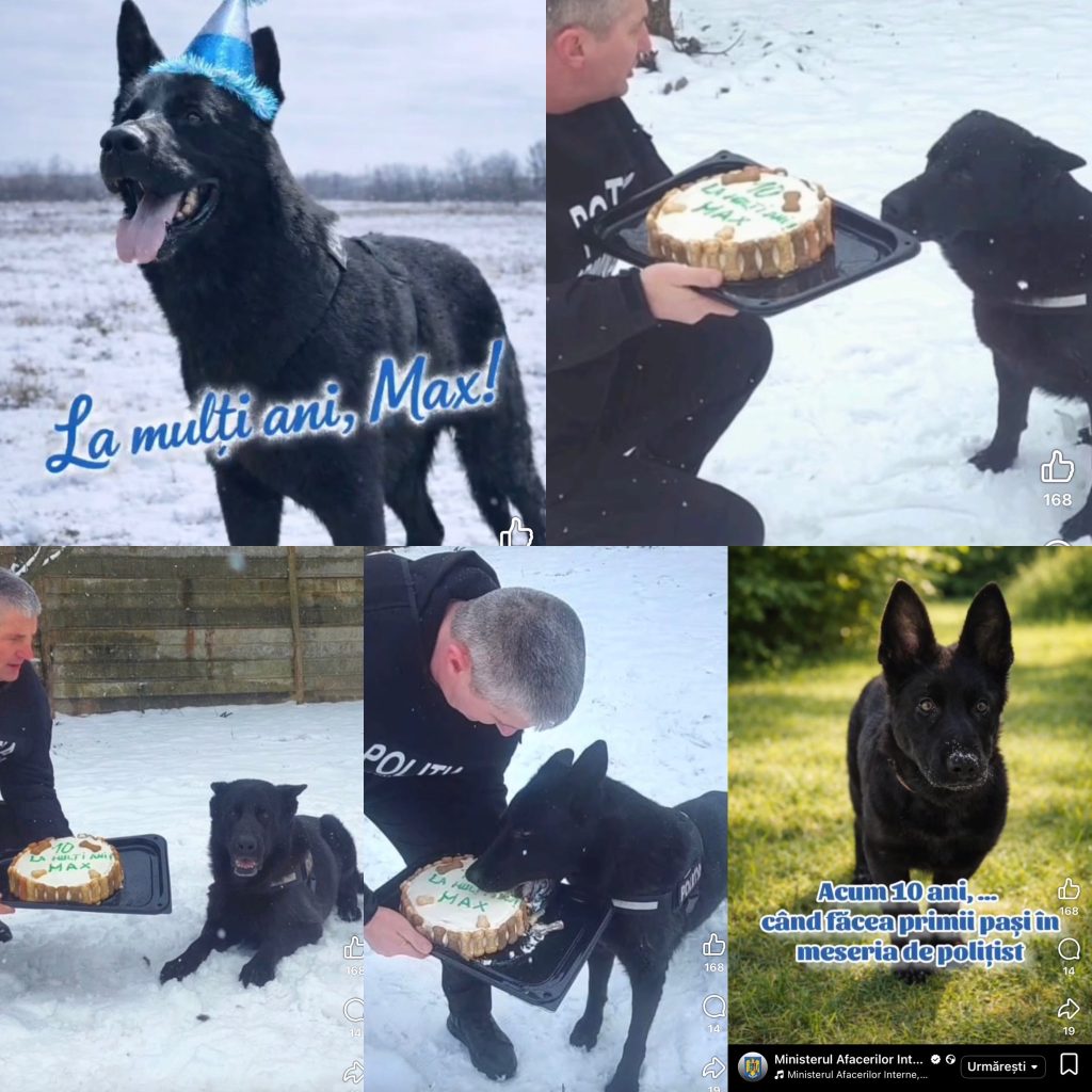 Astăzi, reflectoarele se mută de pe girofaruri pe lăbuțe, pentru că MAX, câinele polițist din cadrul IPJ Gorj – Serviciul Criminalistic, își sărbătorește aniversarea. Nu este doar o zi de naștere, ci un moment de recunoaștere pentru un adevărat profesionist, mereu gata de misiune, indiferent de oră, vreme sau dificultatea cazului. Max a fost sărbătorit cu un tort, făcut special pentru el.