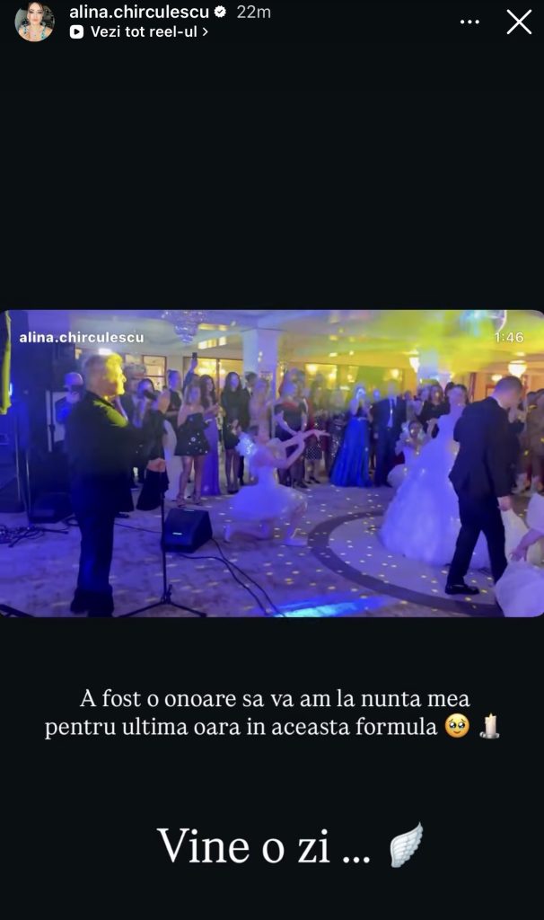 „A fost o onoare să vă am la nunta mea pentru ultima oară în această formulă… Vine o zi…”, a scris Alina Chirculescu, alături de imagini de la petrecerea de nuntă.