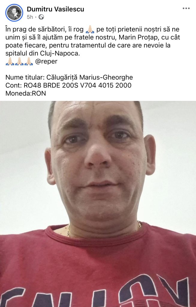 „În prag de sărbători, îi rog pe toți prietenii noștri să ne unim și să îl ajutăm pe fratele nostru, Marin Proțap, cu cât poate fiecare, pentru tratamentul de care are nevoie”, a transmis Dumitru Vasilescu, alăturând mesajului un îndemn sincer la solidaritate.
