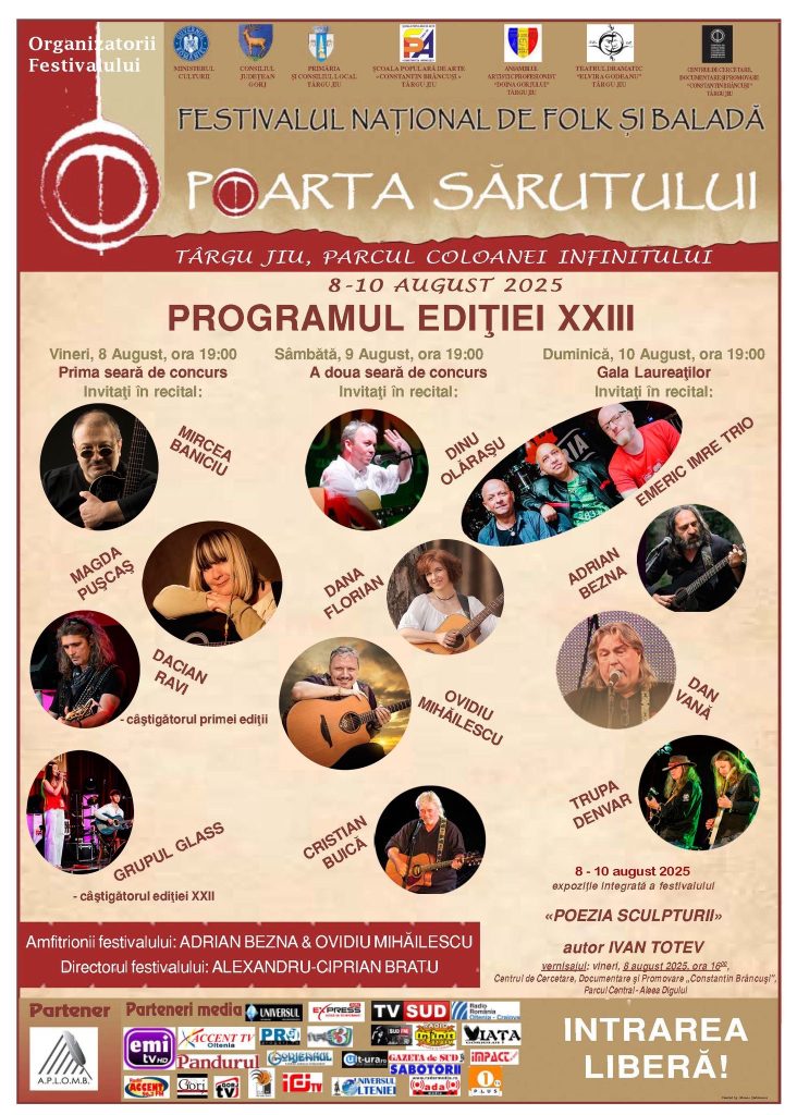 În perioada 8–10 august 2025, Municipiul Târgu Jiu devine din nou capitala muzicii folk, găzduind cea de-a XXIII-a ediție a Festivalului Național de Muzică Folk și Baladă „Poarta Sărutului”. Evenimentul are caracter competitiv și se adresează tinerilor interpreți și creatori de muzică folk din toată țara, fiind o rampă importantă de afirmare artistică.