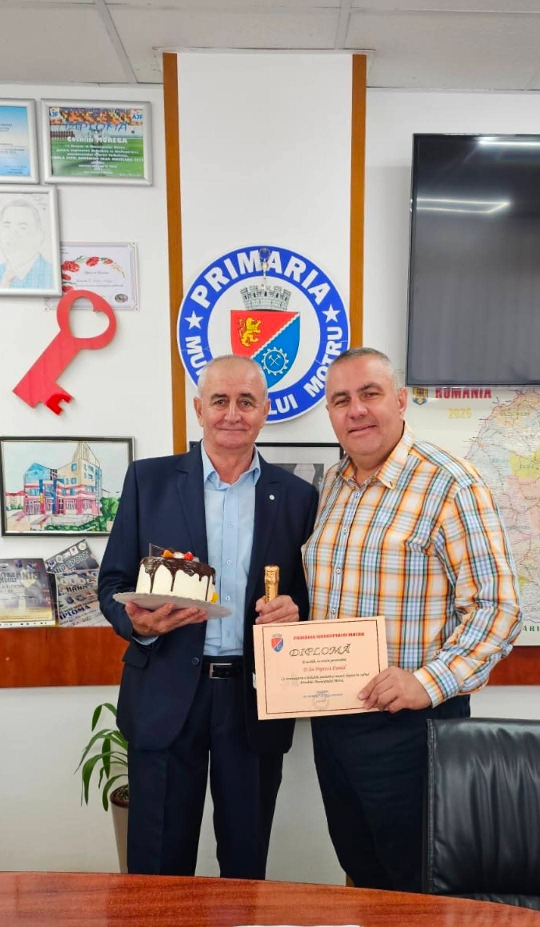 Momentul a fost marcat într-un cadru festiv, în prezența primarului Cosmin Morega, care i-a oferit un tort, o sticlă de șampanie și o diplomă de apreciere pentru activitatea depusă de-a lungul anilor.