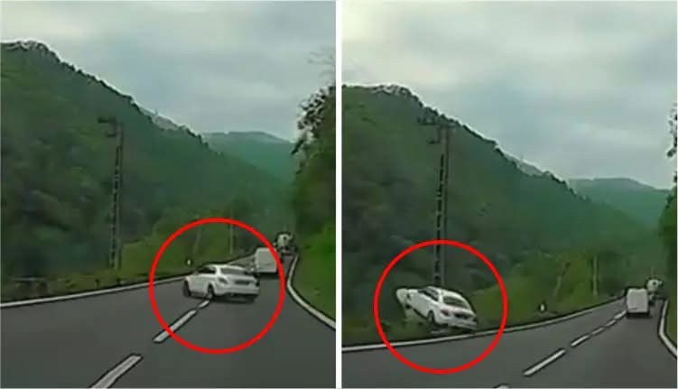 Momentul impactului a fost surprins de o cameră de bord instalată pe un alt vehicul aflat în trafic. Imaginile, care s-au răspândit rapid în mediul online, arată cum mașina părăsește partea dreaptă a carosabilului, revine brusc pe șosea și traversează drumul de-a curmezișul, înainte să se prăbușească în apele râului.