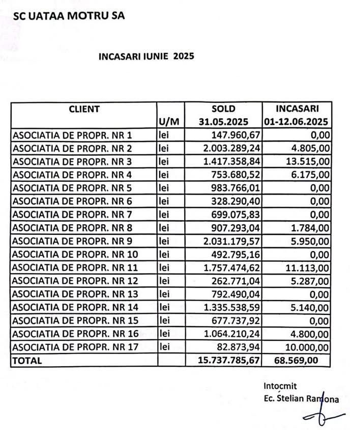 La data de 31.05.2025, Asociațiile de Proprietari în număr de 17, care se afla constituite pe raza Municipiului Motru înregistrează o datorie totala în valoare de 15.737.785,67 lei, iar in cursul lunii iunie (perioada 01-12.06.2025) a anului curent , au achitat pentru energia termica(restanta) si apa calda de care au beneficiat, doar suma de 68.569 lei, conform situației anexate.