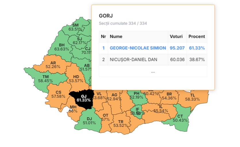 George Simion a obținut cel mai mare procent de voturi din întreaga țară în județul Gorj, unde a fost votat de 61,33% dintre alegători. În contrast, Nicușor Dan a obținut 38,67%, reușind să câștige doar în două localități din județ: Arcani și Stoina.