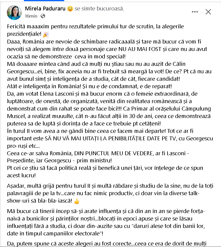 Da, putem spune că aceste alegeri au fost corecte…ceea ce era de dorit de mulți ani și nu reușeam să vedem”, a scris Mirela Păduraru pe pagina personală de socializare.