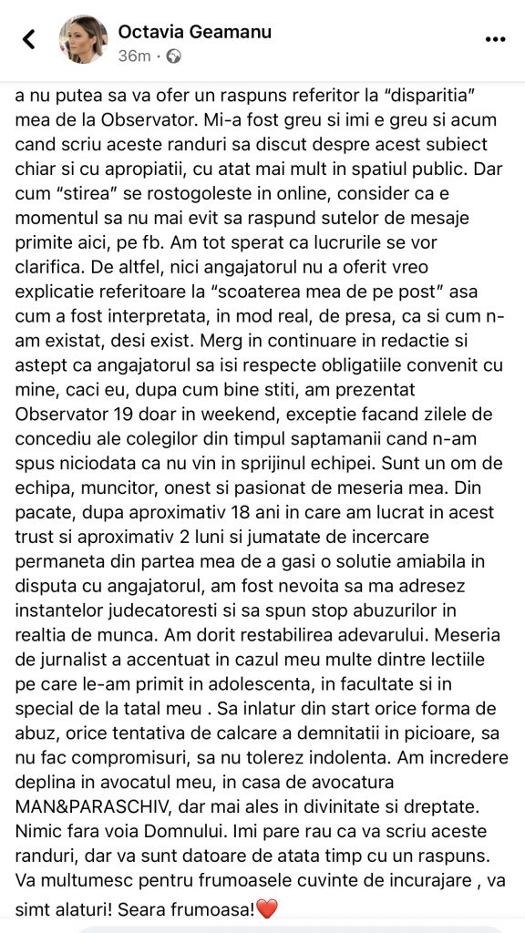 “Întotdeauna am raspuns mesajelor pe care mi le-ati trimis. In ultimele doua luni si jumatate am fost insa in situatia de a nu putea sa va ofer un raspuns referitor la “disparitia” mea de la Observator. Mi-a fost greu si imi e greu si acum cand scriu aceste randuri sa discut despre acest subiect chiar si cu apropiatii, cu atat mai mult in spatiul public. Dar cum “stirea” se rostogoleste in online, consider ca e momentul sa nu mai evit sa raspund sutelor de mesaje primite aici, pe fb. Am tot sperat ca lucrurile se vor clarifica. De altfel, nici angajatorul nu a oferit vreo explicatie referitoare la “scoaterea mea de pe post” asa cum a fost interpretata, in mod real, de presa, ca si cum n-am existat, desi exist. Merg in continuare in redactie si astept ca angajatorul sa isi respecte obligatiile convenit cu mine, caci eu, dupa cum bine stiti, am prezentat Observator 19 doar in weekend, exceptie facand zilele de concediu ale colegilor din timpul saptamanii cand n-am spus niciodata ca nu vin in sprijinul echipei. Sunt un om de echipa, muncitor, onest si pasionat de meseria mea. Din pacate, dupa aproximativ 18 ani in care am lucrat in acest trust si aproximativ 2 luni si jumatate de incercare permaneta din partea mea de a gasi o solutie amiabila in disputa cu angajatorul, am fost nevoita sa ma adresez instantelor judecatoresti si sa spun stop abuzurilor in realtia de munca. Am dorit restabilirea adevarului. Meseria de jurnalist a accentuat in cazul meu multe dintre lectiile pe care le-am primit in adolescenta, in facultate si in special de la tatal meu . Sa inlatur din start orice forma de abuz, orice tentativa de calcare a demnitatii in picioare, sa nu fac compromisuri, sa nu tolerez indolenta. Am incredere deplina in avocatul meu, in casa de avocatura MAN&PARASCHIV, dar mai ales in divinitate si dreptate. Nimic fara voia Domnului. Imi pare rau ca va scriu aceste randuri, dar va sunt datoare de atata timp cu un raspuns. Va multumesc pentru frumoasele cuvinte de incurajare , va simt alaturi! Seara frumoasa” a scris Octavia Geamănu pe Facebook.